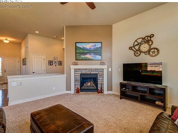 Awesome views of Longs Peak, Mt Meeker & Westedoll Lake. View the lovely sunsets from your covered porch. Fire pit included. Immaculate w/beautiful finishes throughout including granite countertops, gorgeous hardwood floors, copious amount of cabinets, SS appliances, gas stove, tiled bathrooms, ceiling fans & fireplace. Over-sized garage, workbench included. Unfinished basement for future expansion. Private community trails hook up to miles of city trails. Rights to 2 wake-less, stunning lakes.