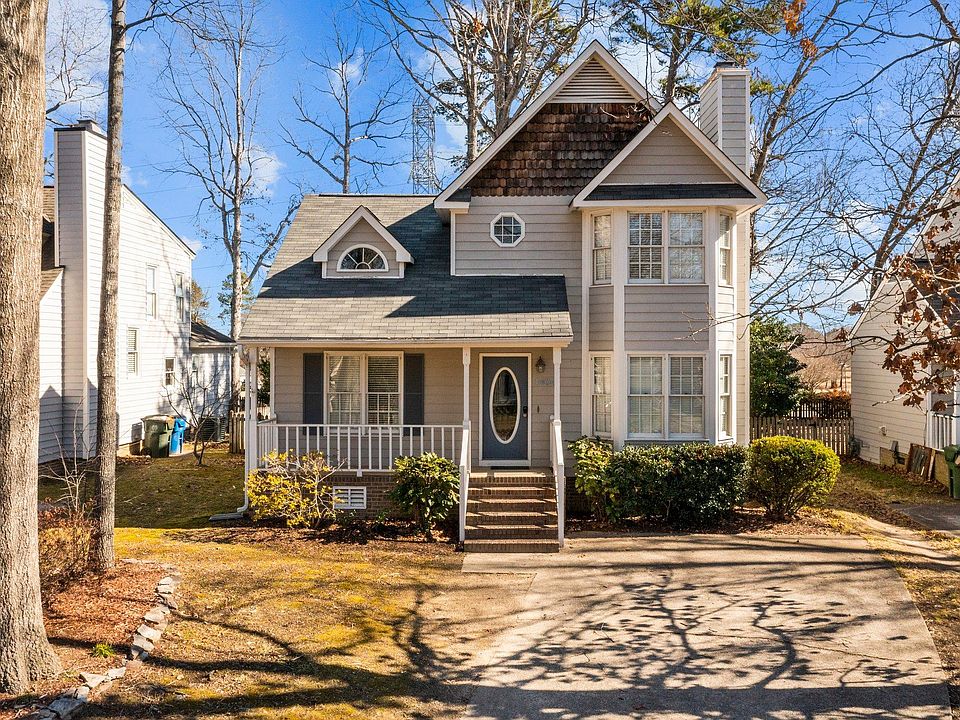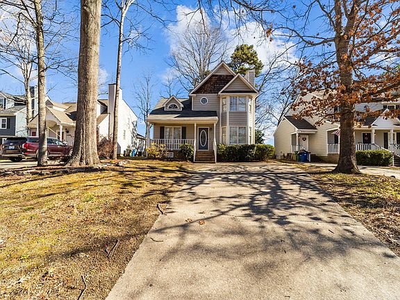 Charming 3 BR, 2 1/2 BA home with rocking chair front porch, oval window-front door, overlooks Hedingham golf course on nice back deck. First floor Owner Bedroom with vaulted ceiling, Owner bathroom w/ tile floors, Dual Sinks, Walk-in Closet, Tile Surround garden tub & separate shower, Family Room w/Gas Log Fireplace w/Marble Surround, Mantle w/Dentil Molding, Nice laundry room, Wider driveway, 2 Storage Sheds, Convenient to 440 & 540. Pool, tennis, clubhouse. Fenced yard! *Note: House exterior is currently being painted One year lease, renter responsible for utilities, no smoking or vaping, pets negotiable, one month security deposit