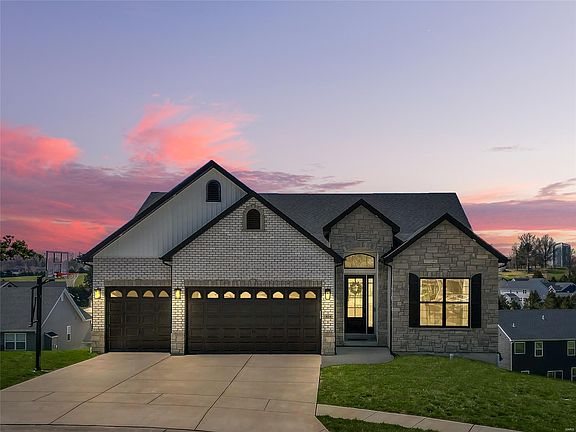 Discover this stunning 5-bedroom, 3-bathroom brick and stone home situated in a peaceful cul-de-sac. Only 3.5 years old, this home offers modern luxury with timeless charm. Step inside to find a spacious open floor plan with 10-foot ceilings, a vaulted living room, and 8-foot doors throughout the main level. The kitchen boasts custom cabinets, granite countertops, double pantry cabinets with pull-out drawers, and smart GE Cafe appliances. Atrium doors from the kitchen and primary bedroom lead to a large, partially covered composite deck with breathtaking views over the subdivision. The primary suite features an ensuite with double sinks and a tiled shower. The finished walkout lower level includes a wet bar, family room, two bedrooms, a full bathroom, built-in bookcases, and two storage rooms. Additional highlights include a stone fireplace and an oversized 3-car garage with a built-in electric heater. Enjoy the convenience of walking distance to all Festus schools.