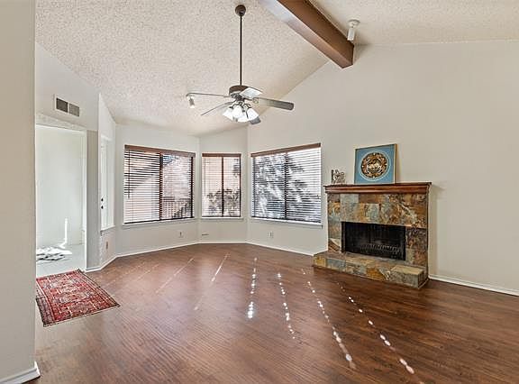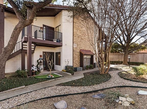 Gorgeous updated beauty in sought after Midway Villas! Feeds into Plano West! Great access to DNT & PGBT. Private end unit setting with soaring ceilings and beautiful natural light, large 1 bedroom, spacious family room with wood burning fireplace. Updates include: 2021 Spanish tile roof, wood flooring at living & master, new tile at kitchen & dining. PRIVATE garage plus assigned parking space conveniently located near the front door! Community pools,park,hot tub. Incredible price point. See it today!