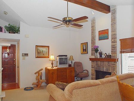 Well maintained second floor unit. Hardwood floors at entry way and kitchen. Neutral carpet in living area and bedrooms. Features include one car garage, mantled wood-burning fireplace, wet bar, full size washer-dryer area, vaulted ceilings, balcony off ktichen, jetted tub, ceiling fans and 2 inch blinds. Recent updates: A-C, wood floors and solar screens. This home has access to two great pools and hot tubs. Great location near Addison, Dallas North Tollway, and George Bush Turnpike. Washe...