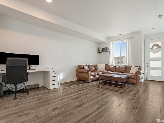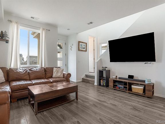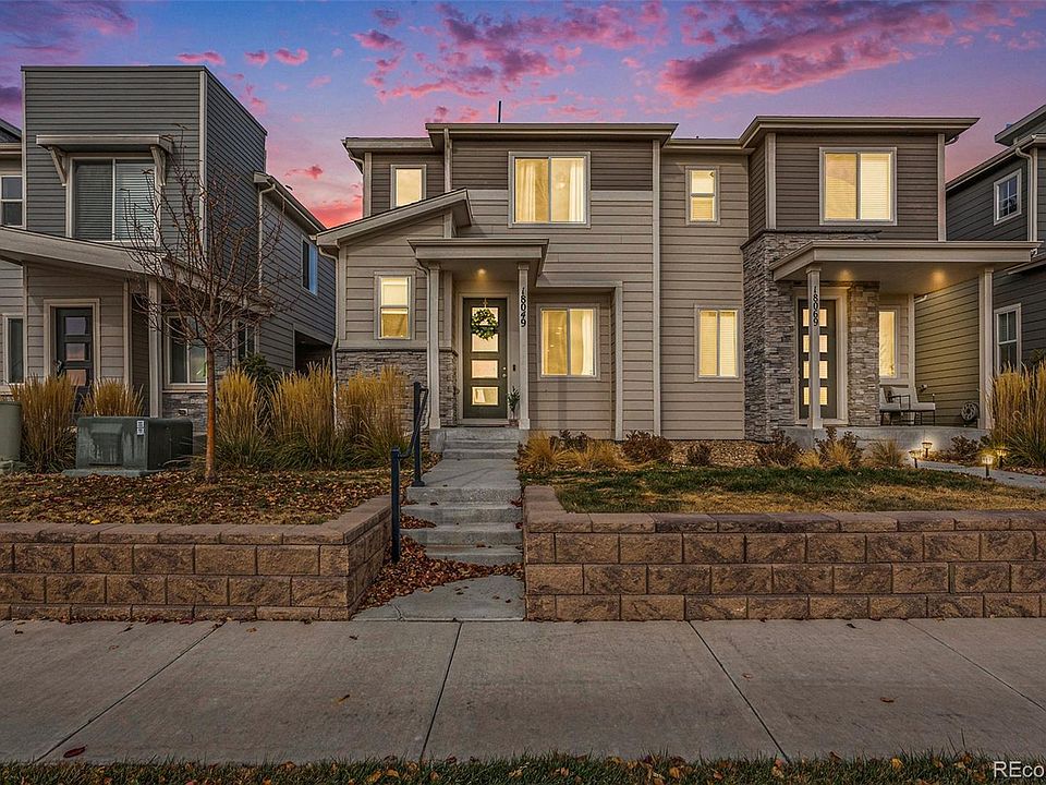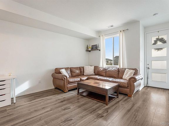 Welcome home to this absolutely gorgeous end-unit townhome in the prestigious Urban Collection at Eastpoint of Commerce City, Colorado. This spectacular home has a stone accented, craftsman style elevation with inviting landscape and a rare attached 2 car garage. This incredible home is nearly new and features a large true open concept floor plan with beautiful style, modern finishes and much more. The true open-concept floor plan features soaring ceilings, extended wood grained wide plank LVP flooring, and is flooded with natural light through the abundance of south-facing large windows. The gourmet kitchen is gorgeous with beautiful white cabinets, extended Quartz counters, center island, stainless steel appliances, plenty of dining space, and easy access to the private deck. The perfectly located and spacious family room has space for the entire family. The incredible floor plan offers a guest bathroom, plenty of storage, and access to the large 2 car garage. Wind your way to the upper-level where you will find a rare double primary bedroom floor plan that works great for roommates or guests with amazing private en suites. Other features include central air conditioning and walking distance to community parks and open space. Just minutes away from E470, DIA, Gaylord Rockies Resort and Convention Center, Shopping, Restaurants, and more!