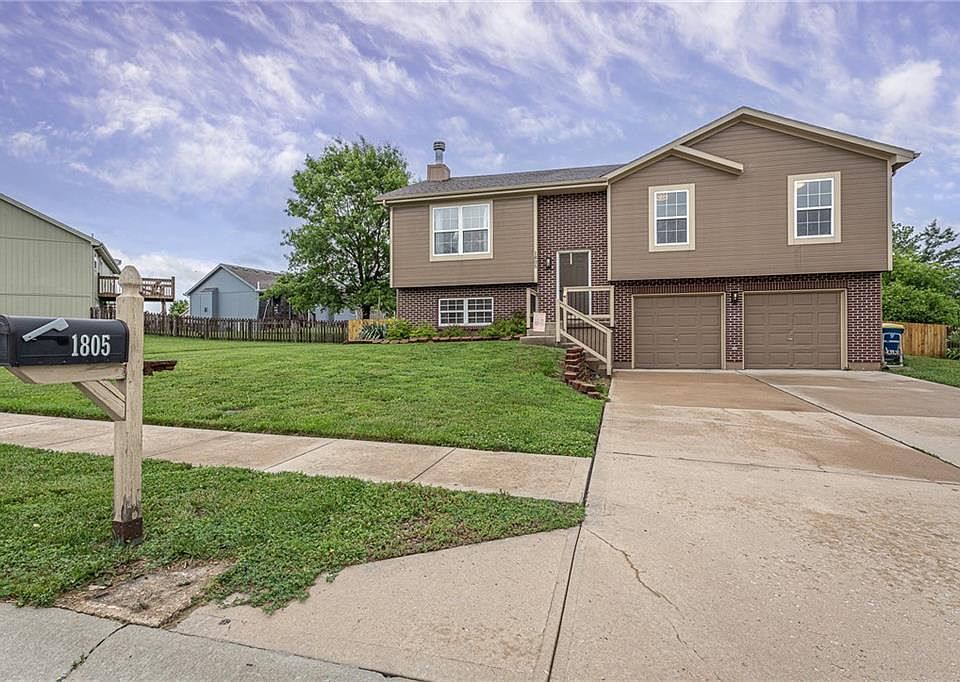 GREAT NEIGHBORHOOD!  WALKING DISTANCE to KEARNEY High School!  You will love the neutral paint palette throughout this home. The living room is open to the kitchen/dining area. Gorgeous dark wood cabinets with tile backsplash, corner pantry with glass door, nice sized island, and lots of light!  Walk out to the deck from the kitchen for easy grilling and entertaining.  The hall bathroom has been tastefully remodeled, and the lighting throughout the home is on trend. The primary suite features TWO walk-in closets, an updated double vanity & wide plank tile floor. A fully finished basement with a 1/2 bath is great for a man cave, a media room, or could be used as a 4th bedroom. The large backyard is fully fenced, with additional storage for mowers and outdoor toys under the deck.  This one is literally move-in ready!