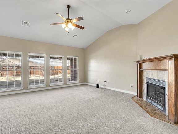 2408 sq. ft of living. 4 bedrooms and 2 ½ baths. An open floor plan. Three dining areas, a breakfast bar, formal dining and kitchen dining. Kitchen has stainless steel appliances, electric range, dishwasher, microwave/vent and refrigerator. A high-rise faucet, under sink filtration and stainless-steel sink. There us tiled backsplash and solid surface counters. Some turntables in corner cabinets and some slide out shelves in lower cabinets. The living room has great natural light. There are blinds on all the windows. There is tile in walkway, laundry, kitchen, kitchen dining and all baths. There is carpet in all bedrooms. Carpet in the formal dining room. The master has panned ceiling with a fan, and crown molding. The master bath has jetted tub, separate shower, double vanities and large walk-in closet. The half bath has a pedestal sink. The laundry room has a folding area, lots of cabinets and the washer and dryer stay. All bedrooms have ceiling fans and panned ceilings. The guest bath has double vanities and a linen closet. There are 2 linen closets in the hall. Landscaped front and back. A large storage building with windows, double doors, wood siding and a metal roof. A 2-car garage with an electric opener and a built in storm shelter. A wood privacy fence. Gutters and downspouts. Great landscaping, front and back.