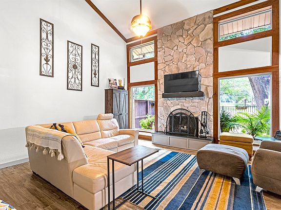 Floor-to-ceiling stone fireplaceThird-level loftPrivate balconyPicturesque backyardLush green spaceGranite countertopsCharming window