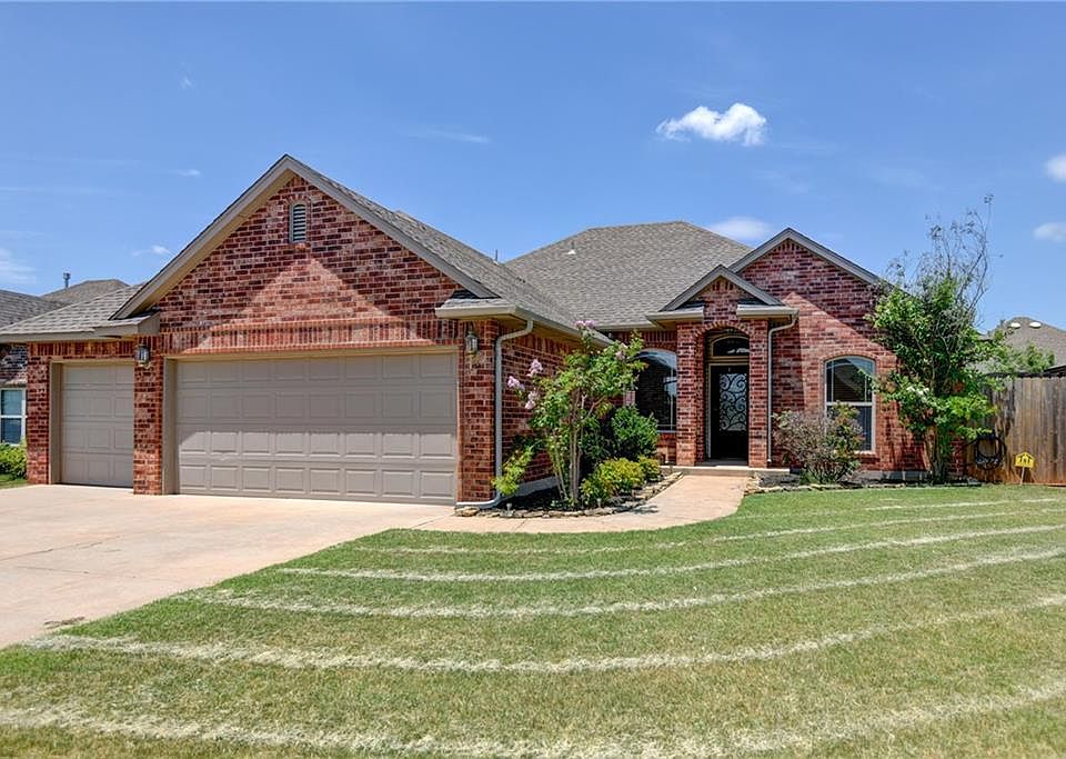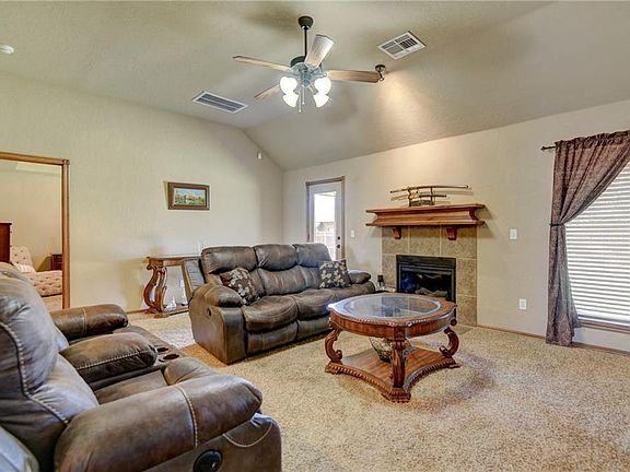 This beautiful home features a large living room with raised ceilings and a tile fireplace with a wood mantle! The spacious kitchen looks over the living room and includes granite countertops, tile backsplash, center island/breakfast bar combo and tons of cabinet space. The master retreat features tray ceilings and a private en suite with double vanities, tub with tile surround and a walk in shower. Entertain on the large covered patio looking over the fully fenced backyard! Home also includes a 16 person storm shelter.