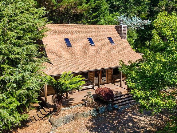 Rare Forest Retreat on 7+ acres in Trinidad. This 2 bed 2 bath approx. 1652 sq. ft. log home in a choice setting has vaulted ceilings, gorgeous rock fireplace, abundance of natural light via windows & skylights, chef's kitchen w/ butcher block, & knotty pine interior including floors, walls & ceilings. Located upstairs is the open concept primary bed & bath. The glass-enclosed dining room w/ deck access overlooking the pond makes for delightful mealtimes. An attached 2 car garage, partial wrap around deck, established native gardens & pond make the exterior of this property just as stunning as the interior. With ample Patrick's Point Dr. frontage allowing for privacy and flat usable areas all around, this property truly is one of a kind! Currently operating as a popular vacation rental.
