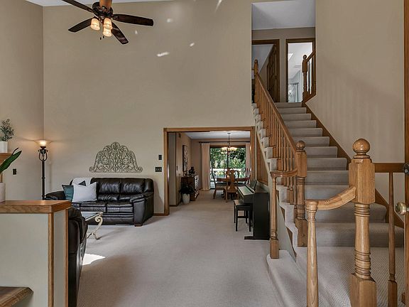 Welcome to this updated and well-maintained home on a beautifully landscaped lot with mature trees and sprinkler system. You enter the home to the living room with large windows and the ceiling soaring to 17 ft. The spacious kitchen has a center island, granite counter tops, black stainless appliances, updated hardware and fixtures, and there are multiple dining areas. There is a family room with vaulted ceiling that could easily be turned into a main floor bedroom. Sunlight pours into the home with many large windows, including patio doors from the dining and family room leading to the 25x14 ft deck. The laundry room is on the main floor, and both the main and upper level baths have been remodeled. You will find three bedrooms upstairs, including the primary bedroom with dual closets and walk through bath. Downstairs offers a family room with fireplace, rec room with lookout windows and a large unfinished storage/workshop area. The garage is oversized, and there is a central vac too.