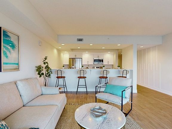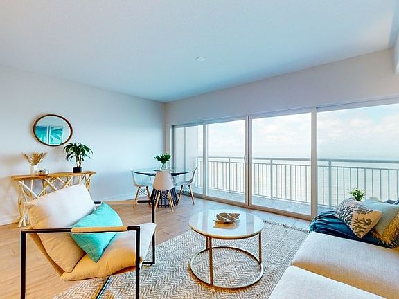 Waterfront condoModern coastal designFloor-to-ceiling windowsOpen-concept floor planUpscale finishesSparkling swimming poolLarge walk-in closet