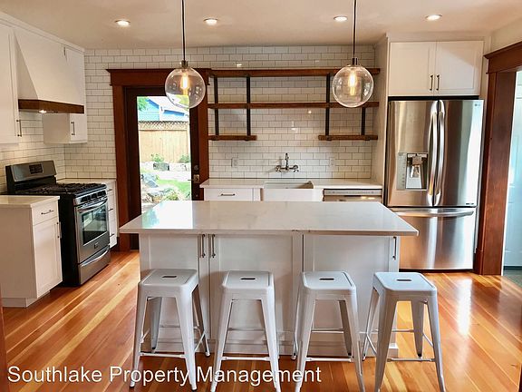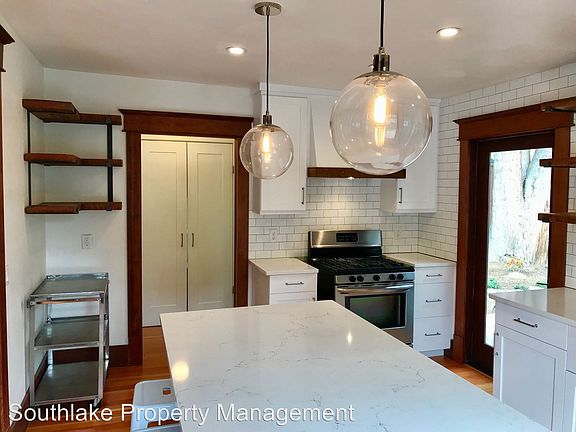 Historic Sellwood home with the kitchen of your dreams - This stunning historic home will win you over with the details! Remodeled kitchen with quartz counters, reclaimed barn wood shelving, and beautiful pendant lighting over the large island. It's open to the living and dining areas filled with natural light and refinished original fir wood floors. The stained glass windows in the living room will bring cheer to even the gloomiest Oregon day. The front porch is waiting for a few rocking chairs to watch the day end with a glass of wine or a local beer. Original details make the entry charming and a large storage closet holds all your necessities. Upstairs is an open landing space that leads to 3 bedrooms and a main bath. Each bedroom has two windows letting in an expanse of natural light. While the bath hasn't been updated, it's spacious, has lots of storage and has an oversized tub. New countertops will be installed prior to tenancy. The back yard is a private haven made for entertaining. The poured cement and flagstone patios allow for plenty of space. The oversized garage has patio doors to the back yard allowing this space to be used in a variety of ways. Washer and dryer are in the garage as well as a work bench. Garage door is manually operated. The long driveway allows for easy off street parking. Walking distance to many Sellwood favorites, and a few blocks from Johnson creek park and the Springwater corridor trail. New roof, newer furnace, and updated electrical allow you to enjoy the character of a century old home in comfort. Bi-weekly landscaping allows you to spend more time enjoying the home without the work! (RLNE4388606)
