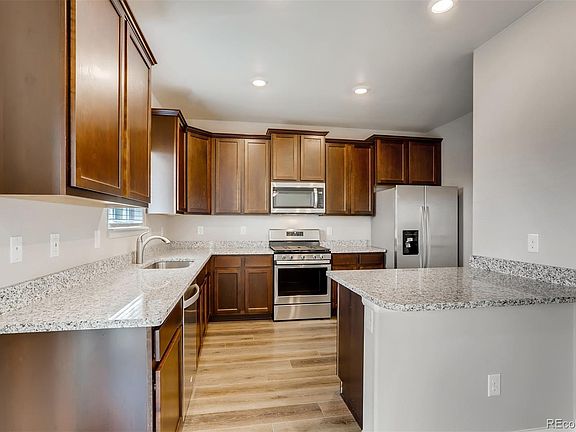 This beautiful new-construction home accommodates all of your desires in a spacious two-story layout designed to enhance your love of home. Three spacious bedrooms provide the space you need to relax at the end of the day. Two full bathrooms plus a powder bath for guests allow for additional privacy. Stainless steel Whirlpool® kitchen appliances, quartz countertops, 42-inch upper wood cabinets in the kitchen, recessed LED lights in the kitchen, stylish plank flooring, 2-inch blinds on every operable window and so much more are included in this home. Other incredible features of this home are the covered porch at the front of the home and the covered patio in the back. Located in Commerce City, the charming community of Second Creek Farm offers peaceful surroundings, picturesque landscaping, and a community park.