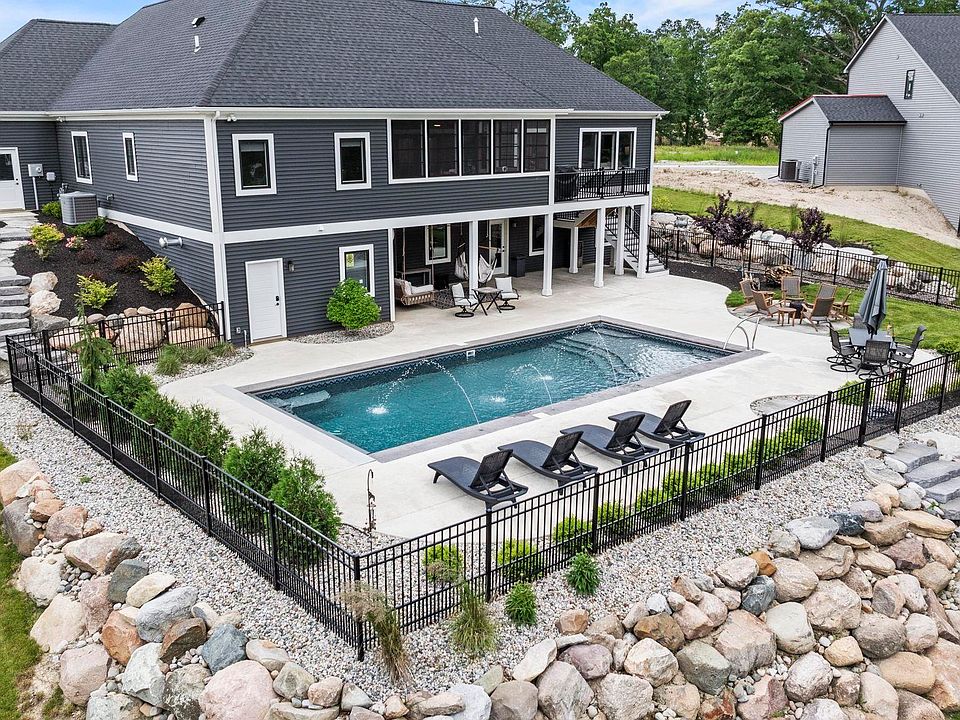Luxury Custom-Built by Robert Koors Custom Building & Design. Step into this 3300+ sq foot meticulously crafted home by Koor Custom Building & Design. From the moment you enter the stunning foyer, you're greeted with elegance and sophistication. Adjacent to the entrance is a versatile space, perfect for an office, nursery, or sitting room. The main level boasts an expansive open-concept layout, ideal for entertaining. The GR is the heart of the home, featuring a gas fireplace, beamed ceiling, and breathtaking views of the backyard. The chef’s dream kitchen is equipped with double islands, solid surface countertops, custom cabinets, double ovens, a gas range with pot filler, tile backsplash, wine cooler, under-cabinet lighting, and an oversized walk-in pantry. The adjoining dining room and kitchen seamlessly flow into a three-season room, featuring double sliding doors, a gas fireplace, a decorative wood ceiling, surround sound, and access to a composite deck and pool area. The main level houses a luxurious primary suite. The serene bedroom with a luxury bath, featuring a double vanity and walk-in shower, dual walk-in closets provide ample storage, with one measuring an impressive 18x12, complete with an island for additional storage. Conveniently, the walk-in closets connect to the laundry room, which includes abundant cabinetry and a utility sink. The lower level is designed for relaxation and entertainment with additional space to finish if desired. It features a family room with a wet bar, including a wine cooler and custom cabinets, and two bedrooms, each with private baths. Additional amenities include 2 oversized storage areas with one section hosting all the pool equipment. This home is equipped with modern conveniences and high-end features: surround sound throughout, electric blinds, granite countertops, a water softener (salt system upstairs), an alarm sump pump, jets in the pool, and an elaborate landscape design. The outdoor area is equally impressive with an Elephant cover for the pool, a fenced yard, an irrigation system, a Ring security system, motion lights, and decorative driveway and sidewalk with a designer garage door. The dramatic stone front porch entrance and a walk-up attic from the garage add to the home’s unique charm and functionality. Every detail has been thoughtfully designed to offer the ultimate in comfort and style.
