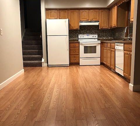 Great 3 bedroom home with beautifully tiled entryway floors with large coat closet 2 newly renovated modern bathrooms Spacious living room open to dining area Patio off dining area 3 bedrooms upstairs Basement has huge rec area or 4th bedroom and large storage closet with built-in shelving 1 Car garage Fully fenced in back yard Will accept well trained dogs No Section 8 Tenant Pays All Utilities