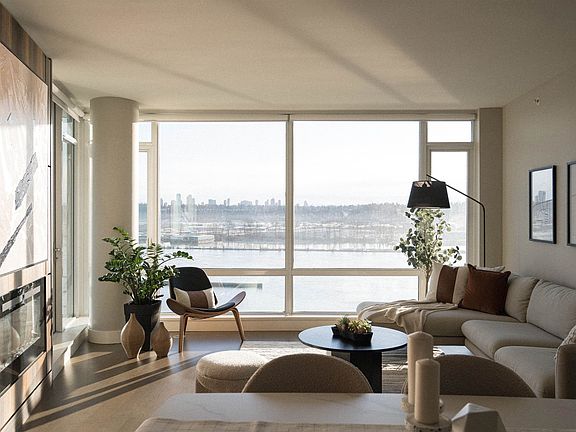 Welcome to Unit 1806 at The Peninsula, offering stunning bird's-eye views of the Fraser River! This 2 bed 2 bath concrete high-rise apartment by boutique developer Aragon is nestled in Port Royal, a serene master-planned waterfront community in Queensborough, New Westminster. Enjoy luxury living with a gourmet kitchen featuring Gaggenau appliances, a concierge service, and hotel-style amenities, including a resident lounge, guest suite, and gym. Perfectly situated, this home is a short 10-15 minute bus or scenic Q2Q Ferry ride to 22nd Street or New Westminster SkyTrain stations, combining comfort, convenience, and an elevated lifestyle.