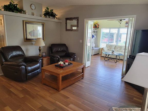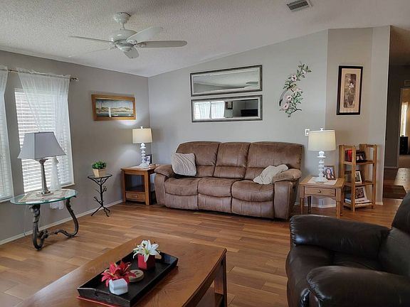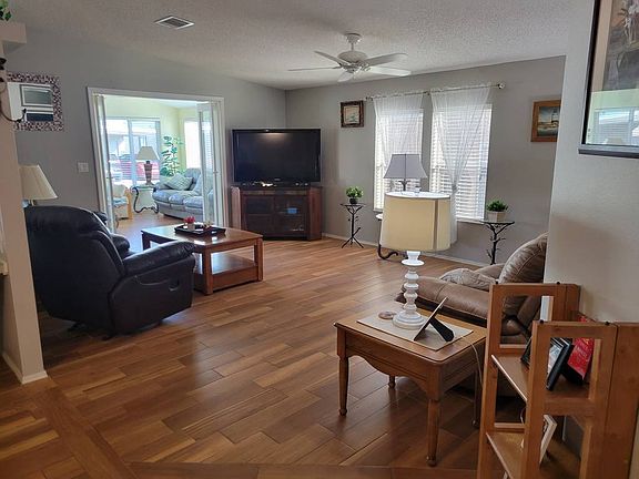 Homes in the Four Lakes Golf & Country Club, a 55+ golf community, are on lot leased land. Owning the home, but not the land, you pay a monthly lot rent of $664 which gives you and your guest access to the amenities of the community........... This 1697 sq. ft. home not only has impeccable landscaping, the home itself is just as perfect........... Features: * Gorgeous tile that looks like wood throughout the majority of this home... easy upkeep!... * Totally TURNKEY with furnishings, linens, etc.... * Front room has been made into a Florida room with glass windows and glass bifold doors... * Open floorplan... * Built-in hutch... * Built-in buffet... * Separate laundry with access to outside screen room... * Primary bedroom with closets along full length of room... * Primary bath with step-in shower... * Guest bedroom with large closet... * Guest bath with tub/shower combo... * Garage decorated for a mancave although it can easily be reverted to a garage... * Extra refrigerator and freezer in garage.......... Four Lakes Golf Club is an affordable, award-winning retirement community. It carries on that tradition with only the finest homes, amenities and service that is second to none. Anyone looking for an active retirement community in the central Florida area need look no further...... Amenities include: 22,000 sq. ft. full service clubhouse; Four beautiful lakes with marina; Large heated swimming pool; Master whirlpool spa; 18 hole regulation golf course; Billiard and game room; Library & surround sound theater; 24 hour gated security; Exercise room with sauna; Fully equipped crafts room w/ kilns; Putting greens and pro-shop; and Access control gate with attendant. Pets under 40 lbs. allowed.