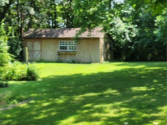 The property features a small creek, wooded area, and mature trees for ample shade. A 14' x 28' shed in the back includes storage and a finished, insulated, powered workshop.