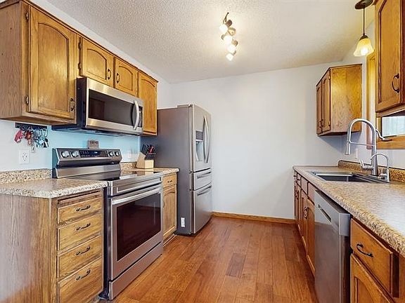 Welcome to this 4-bedroom, 2-bath split-entry home offering functional space and a great layout for everyday living. The concrete driveway provides extra parking along the side of the garage—perfect for storing your boat, camper, or extra toys. Inside, natural light pours through the large picture window in the living room, creating a warm and inviting space. The kitchen is equipped with stainless steel appliances and opens to the dining area, where you can enjoy meals inside or step out to the backyard deck—great for grilling or relaxing. The main living level features the spacious primary bedroom with a walk-in closet, plus a second bedroom and a full bath with heated floors. The lower level includes two additional bedrooms, a ¾ bathroom, a cozy family room, and a dedicated laundry area. The backyard offers plenty of room to run, play, or entertain.