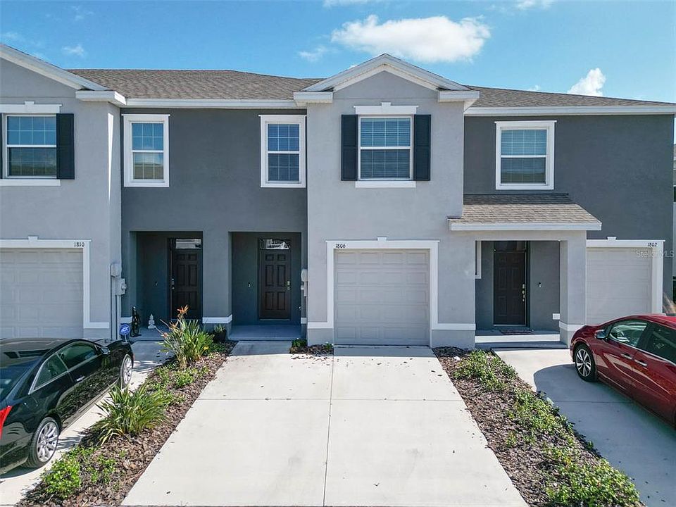 PRACTICALLY NEW - BUILT 2019! 3 bed, 2.5 bath, 1 car garage (driveway can fit side by side cars!), 1, 673sqft townhome. ALL APPLIANCES INCLUDED (YES, washer, dryer also!). The home includes all block construction and energy-efficient windows, appliances and A/C unit for LOW UTILITY BILLS!! AMAZING AMENITIES - resort-style pool, fitness center, park, playground, trails, dog parks. The kitchen is part of the OPEN FLOOR PLAN and consists of granite countertops, stainless-steel appliances, 42" tall cabinets, and an extra-large pantry. The larger living room is flooded by natural light thanks to the tri-slider leading to the expansive lanai. The entire upstairs has new laminate flooring with extra padding to absorb and minimize the noise level to the first floor! The master bedroom has 2 CLOSETS and a beautiful master bathroom with walk-in shower and double vanity. The secondary bedrooms are big enough to accommodate a bedroom and desk combo, if needed, and have larger closets as well.