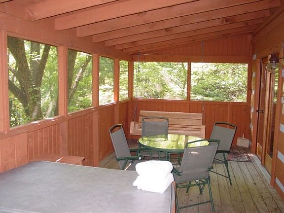 This private, true log cabin with metal roof, sits on .7 private, wooded acres (with the second lot that is conveying.) and is KILLING it on the rental program with over $39,000 in rental income this year. NO HOA fee. A cathedral ceiling gives the great room a large feel and features pristine condition, 3/4 inch, oak hardwood in living room /dining room, with ceramic tile in both baths for low maintenance living. Newer carpet in both bedrooms A cozy gas log fireplace has a great flame and surrounded by natural stacked stone. Both bedrooms have king size log beds with exposed beam ceilings. Handicap accesible (but not ADA compliant) The master bath has a double sized whirlpool tub with a "stacked stone" surround. The galley kitchen has been upgraded with Hickory cabinets. A stacked washer dryer in the second bedroom closet The screened porch out back offers privacy and a wooded view from the hot tub and even includes an exterior pool table. Granite top dining room table and seating for at least two at the kitchen bar Covered front and back porch Conveys with two lots Most furniture less than a year old