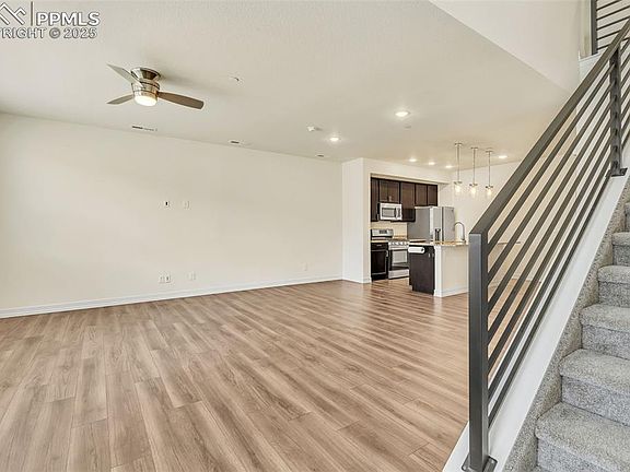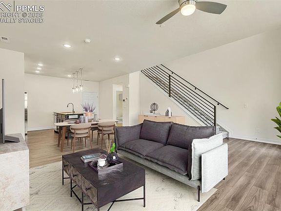 Welcome to The District at Victory Ridge with no maintenance living at it's best! This townhome offers a spacious open floor plan in the Interquest corridor! The open concept main floor plan has lots of natural light, LVP flooring throughout the living room, dining room, kitchen, and bath. Kitchen has an island with seating and pendant lighting, stainless appliances, granite countertops, gas stove, pantry, built-in microwave, and side-by-side refrigerator. Garage has built-in shelving and easy kitchen access. The upper level has 3 bedrooms, 2 full baths, and laundry. AC plus ceiling fans and tankless water heater. Master has dual sinks and large shower. There is an inviting common grassy area off the front fenced patio area with magnificent mountain views, and guest parking. Located in the award-winning School District 20 area, this home is near everything you need for comfortable living. Great shopping right down the road at the Shops at Briargate, new restaurants are popping up everywhere, and so close to jump on I-25 to get to Castle/Rock or Denver or even our growing Downtown scene in Colorado Springs! easy I-25 and Air Force Academy access and public transportation, walking trails, and so much more. This one is a gem with so much to offer.