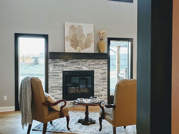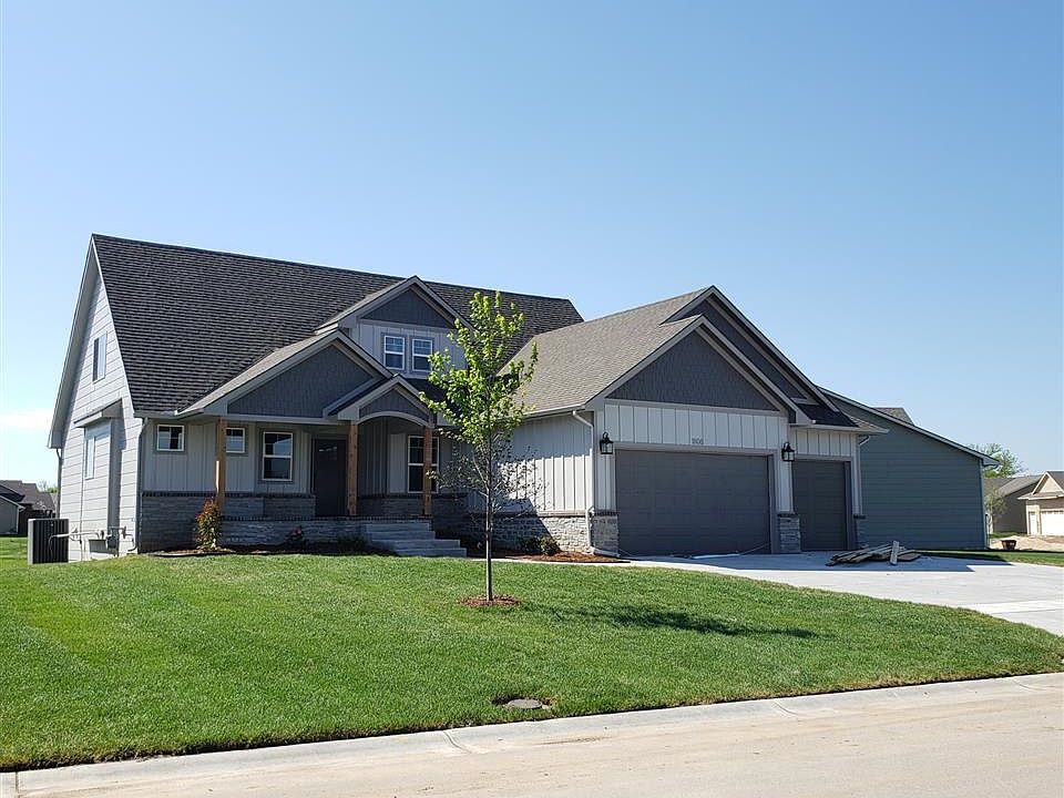 New home backs up to a lake with a main floor master, and a separate formal dining room or private office. The family room reaches up to a 20 ft ceiling with windows over the fireplace bringing in natural light, and is open to the kitchen that has a HUGE movable quartz prep table, and the basement walks out to a patio under a covered deck. This energy efficient home has all the upgrades you've been searching for, and has the very low Sedgwick County taxes (1.16 Mil Levy) in a quiet neighborhood with a saltwater pool, 3 lakes, great fishing, and walking paths surrounded by nature, but minutes to town. Price includes well, sprinklers and landscaping!