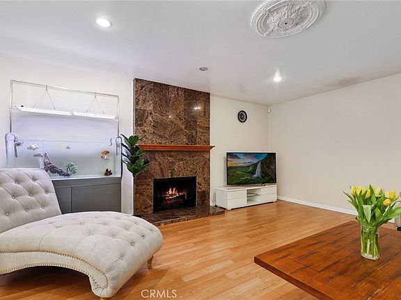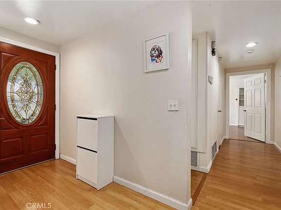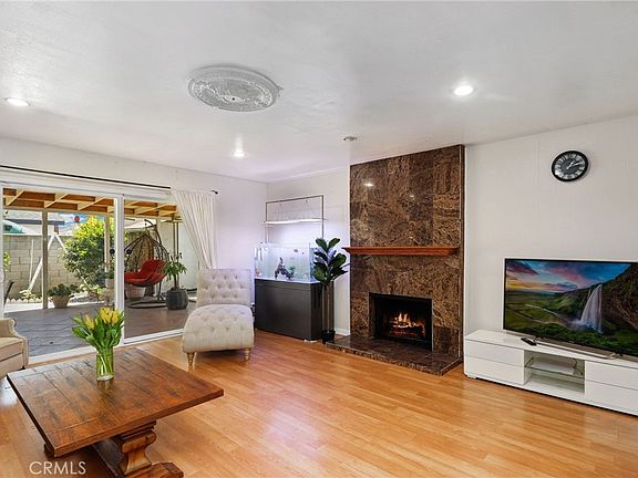 Beautiful single level, 3-bedroom with modern light tones, recessed lighting, ceiling fans and upgraded laminate plank flooring makes for an elegant space. The living room boasts a beautiful floor to ceiling marble faced fireplace with a large slider to the backyard. The large windows allow an abundance of natural light to illuminate the open floor plan throughout. The kitchen has Cherry tone cabinetry, some glass inset cabinet doors, granite countertops, full backsplash, tile flooring, plenty of storage and countertops. The appliances include a gas cooktop, range hood, a double oven, dishwasher and refrigerator. Adjacent is a dining area with direct access to the garage. The primary bedroom features an ensuite with walk-in closet, a three-quarter bathroom single sink vanity and shower. The two secondary bedrooms have blinds, ceiling fans and mirrored wardrobe closet doors. The full bathroom has a single sink vanity and shower in tub. Relax in the backyard with a covered patio, grassy area, planters perfect for gardening, a variety of fruitful mature trees, side yard and block walls. Enjoy the large private from patio area and grass area. A two-car garage, gated extended driveway, direct access, storage, laundry area with washer and dryer. Nearby park, shopping, restaurants, easy access to 5 and 55 freeways. No HOA. Welcome home!