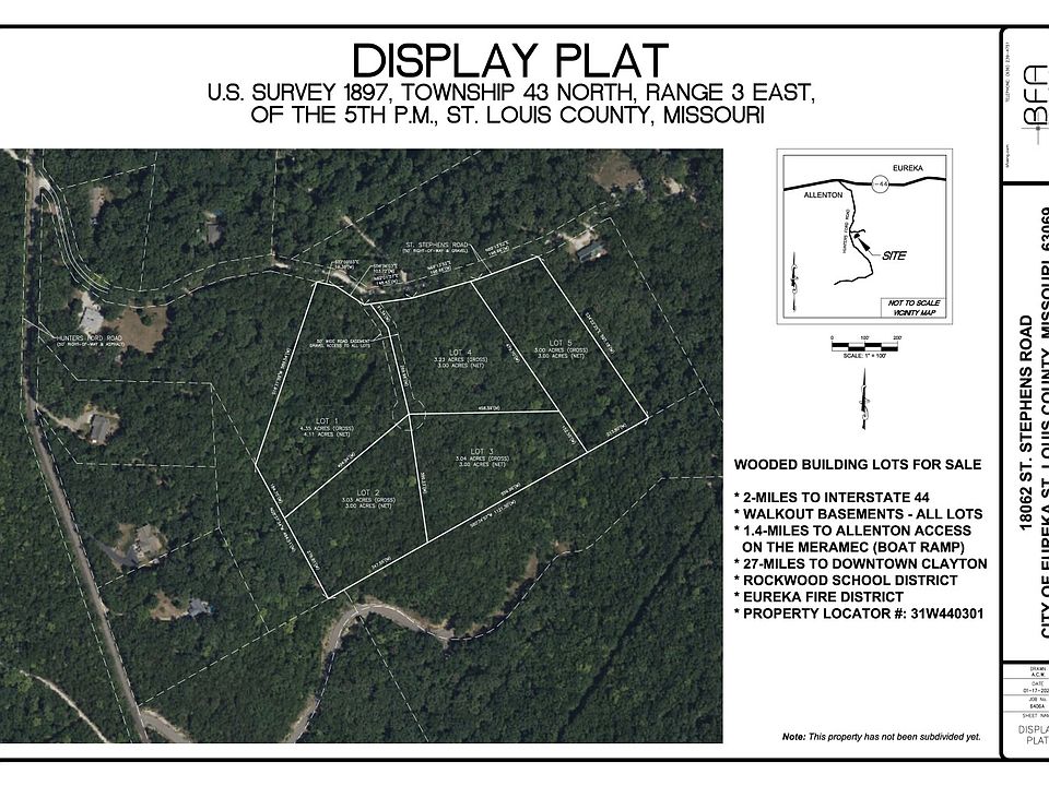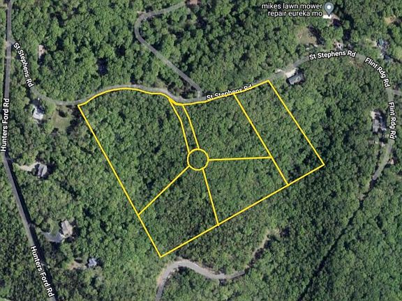 3-4 acre residential lots located less than 2 miles south of Interstate 44 inside Eureka city limits.All lots have been pre-engineered for walkout homes. The land itself has been surveyed, but not developed. Some lots do have public road frontage. Seller is willing to cost-shareto provide better access, depending on the lot.The land sits off of St. Stephens Road branching from Hunter's Ford Road- 1.4 miles to the Allenton Access to the Meramec River. One of the lots has undergone and passed a perc test. Three of the lots will have frontage along St. Stephens Road. The other two will be accessed via 50' road down the middle of the property. The property is ideal for a builder, developer, or someone looking to buy hold as a long-term investment. The land has no deed restrictions but does fall within Eureka ordinances.
