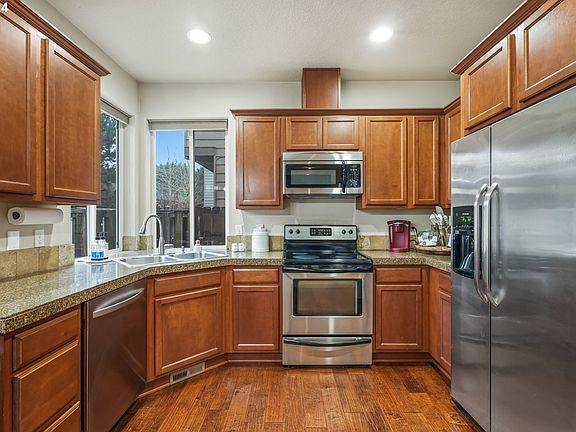 Enjoy open concept living, natural lighting throughout, and your very own touch on this amazing traditional home nestled minutes away from downtown Sandy and Mt. Hood. Stainless appliances, granite counters, wood floors in kitchen and dining nook. Natural light and gas fireplace in family room. 4 bedrooms upstairs along with primary walk-in closet, double vanity sink, and laundry room. AC, Solar panels, and a spacious fenced in back yard with expanded patio. Great for hosting any gathering!