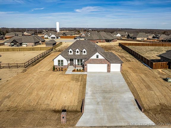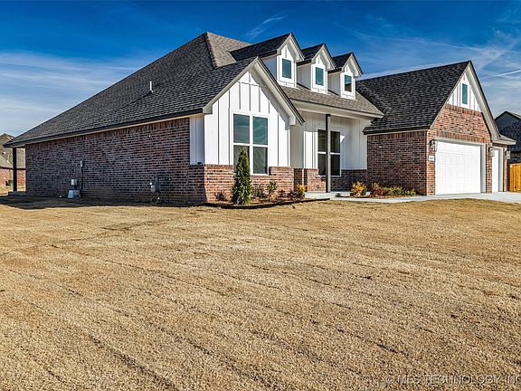 New Construction home features full brick, gutters, over half acre and just minutes from downtown and Tulsa Hills in the Berryhill School District. This large 1 level homes has 5 bedrooms, 2 full baths and a half bath for guests. Gorgeous dark stone style ceramic floors greet you into a spacious great room with a gas plumbed fireplace flanked by maple wood bookcases and floating shelves. The massive kitchen has a large pantry, Maplewood cabinets with soft-close drawers, farm sink, granite, gas stove and wall microwave and oven. The great room also features a large space for your dining table and a 4 person island. The primary is a kings sized suite with a jaw dropping soaking tub, walk in tile shower with heavy glass, double sinks, double drawer bank, wet closet and plenty of closet storage. Three more bedrooms and an office, two full baths, large laundry and oversized three car garage make this a steal! The lot is massive with room for a pool and an outbuilding.
