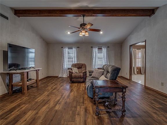 Rare find in El Reno! This lovely ranch-style home is situated near I40, for a quick commute to the city, and downtown El Reno. Sitting on over an acre, this home features a wood-beamed cathedral ceiling in the living room, updated stainless steel kitchen appliances, laundry room with built-in storage, and granite counter-tops throughout. The master bathroom has double vanities, a wood-tiled shower, and a spacious walk-in closet. The guest house is, essentially, a 1 level, 1-car garage apartment equipped with a bathroom, built-in cabinet storage and a sink. In the backyard, there is a concrete foundation ready for a workshop and an additional carport! Book your showing today!