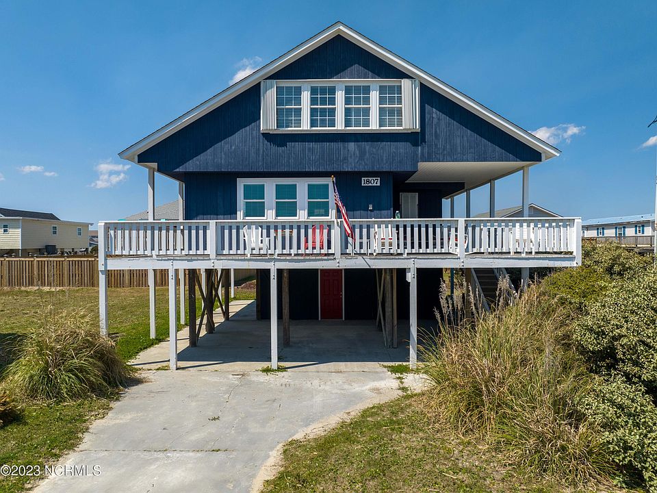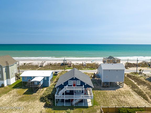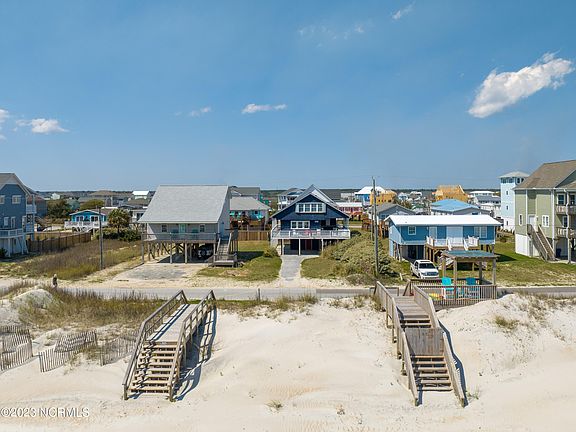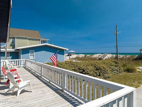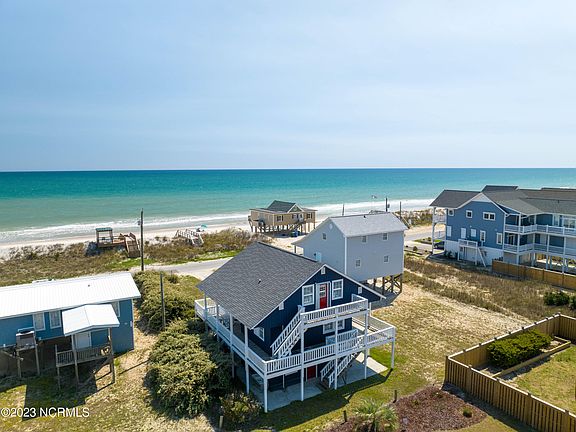 This fabulous 3 bedroom 2.5 bath beach house offers exactly what you expect in a classic beach home! Unobstructed views on deep lot provides sweeping and breathtaking ocean scenes from the wrap around deck! When you open the front door, you are instantly transported into that happy space of the classic beach cottage vibe that is sure to create lasting memories! The open, airy and colorful floor plan allows for everyone to have their space but yet time together as well. The decking allows for breakfast or dinner outside no matter what the weather with perfect, picturesque views of all nature has to offer! 1 bedroom on the main living area and 2 upstairs provide just the right amount of space but WAIT, there's MORE! Separate square footage on the ground level provides additional space for a rec room, extra sleeping arrangements, a man cave~over 300 SF of whatever you can think to claim this space for! It comes complete with a small kitchenette and a full bath, all heated & cooled as well! Hurricane shutters on many windows and 150 mph windows on the front main floor windows & a new HVAC being installed 4/3/23, the other in June 2021. This is timeless home~don't miss this gem on Topsail Island~it will not last long!