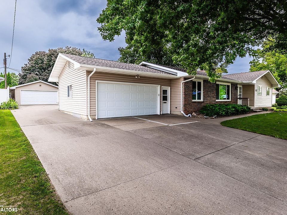 Beautiful on the south side with 2 bedrooms, 1 1/2 baths, insulated 2 stall garage and a spectacular 20x40 detached garage built in 2000!!! Don't miss this gem with front door foyer, oak kitchen with snack bar, dining with gas fire place and built-ins, large living room or living room/formal dining, a walk in from garage into laundry with broom closet and soak sink all on the main level. Take it to the lower level with family room area with built-ins, game area and a 3/4 bath. Enjoy the outdoors that's like a walk in the park with an amazing covered deck off the dining area, a large patio, amazing firepit area and pristinely landscaped!!!! Call today for a private showing.