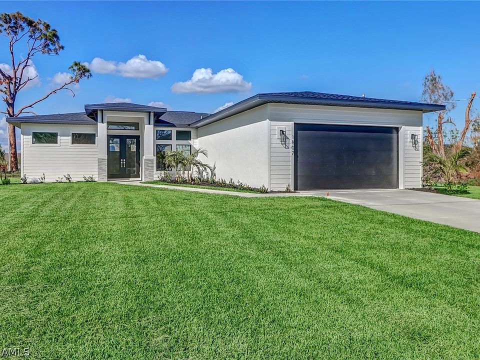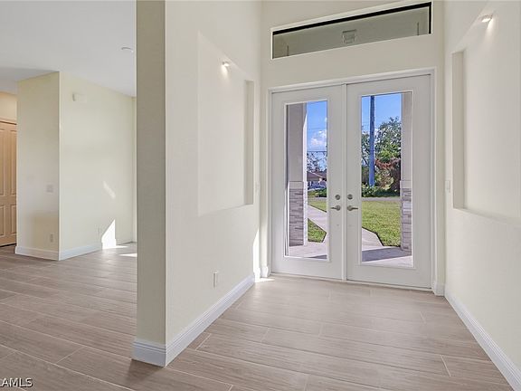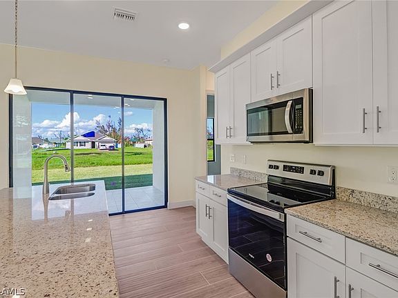 Welcome to your dream home in Cape Coral! This stunning single family home boasts 4 bedrooms, 2.5 bathrooms, and a 2-car garage. The interior features granite counters and stainless-steel appliances in the kitchen, as well as a combination of carpet and tile flooring throughout. The oversized lot provides ample space for outdoor activities and entertaining guests. The 14" entry, stylish stoned columns, and glass double doors create a grand entrance that will leave a lasting impression on all who enter. The solid wood shaker cabinets and planked tile floors in the living area add a touch of elegance to the home. With 4 zone irrigation, maintaining the lush landscaping will be a breeze. This home is conveniently located close to dining and restaurants, making it easy to enjoy all that Cape Coral has to offer. Don't miss out on the opportunity to make this beautiful home yours!