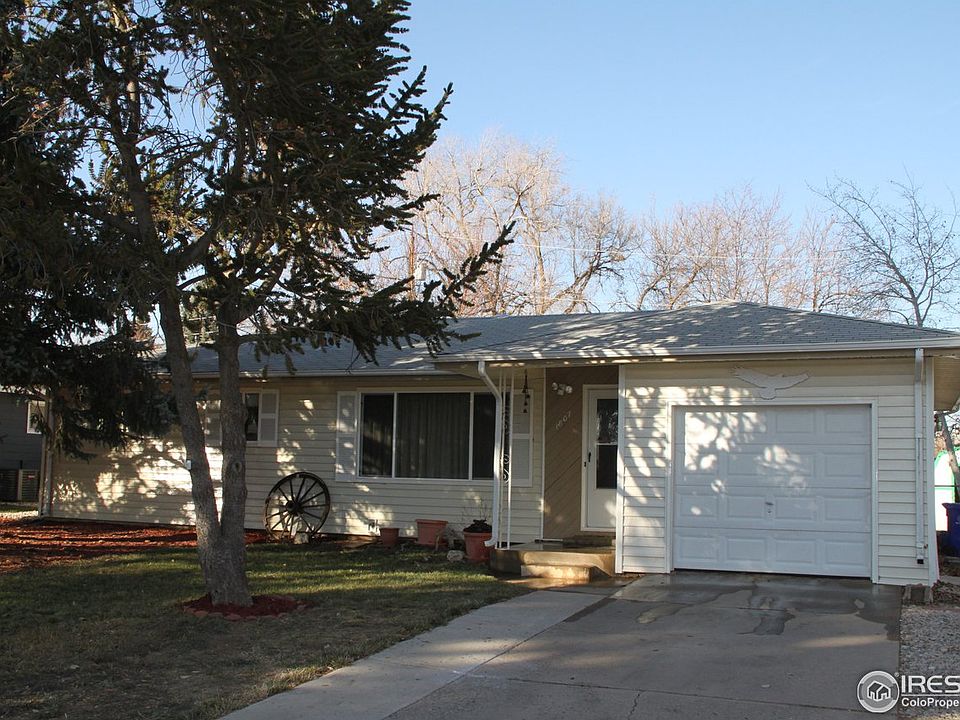 Located on the west side of Loveland is this darling 1000+ fin sq. ft. home. The garage has been converted into an additional unpermitted 200' sq. ft. room can be used as an office, craft room or family/play room. Step inside to an airy living room complete with hardwood floors in great condition. 3 bedrooms/2 baths, an eat-in kitchen w/ a flat top electric stove. XL fenced back yard with garden boxes, large storage shed and covered back patio. Washer & Dryer are included.