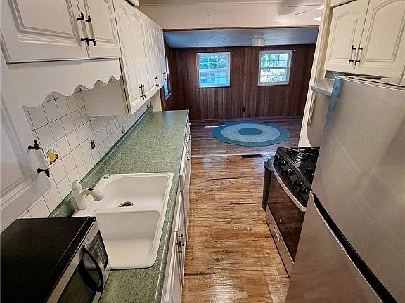 Utility roomManageable yardDining roomWhite cabinetsStainless steel refrigeratorGas stoveGalley style kitchen