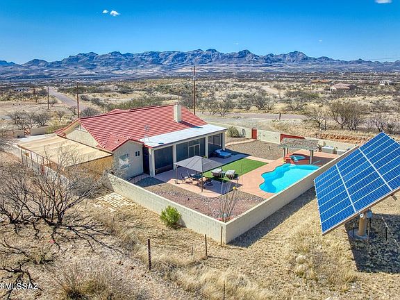 This gorgeous property is nestled in beautiful Southern Az, with spectacular views of The San Cayetano Mountains and surrounding areas. Enjoy the pool, spa, screened Az. room, ramada area, while experiencing the peacefulness and tranquility that this home has to offer. Also included is a solar tracking system that is owned not leased. The large living area features a dual fireplace, and beautiful French doors that lead to the magnificent Az. room and backyard. Also included is a huge covered area for your RV or extra parking space. The garage can be reconverted to a guest suite, or any other space that you desire. ( A full bathroom and HVAC , a space for a stove etc. already in place. Come and view this spectacular property and make it your new home!