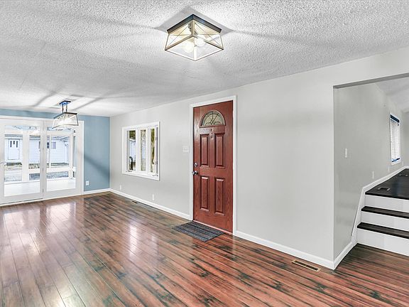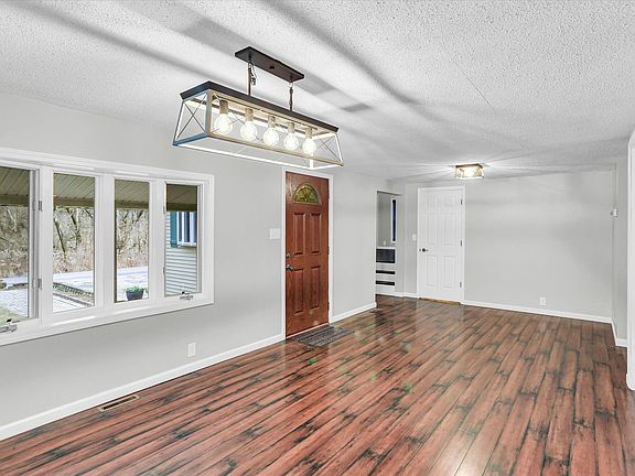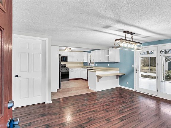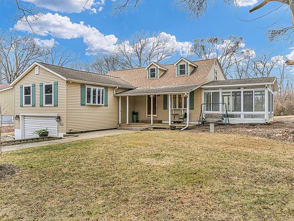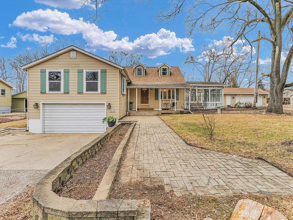 This is a unique property that includes over 6/10's of an acre, 3 bed, 2 bath home and 5 total garage spaces. Step inside and you'll find updated plank flooring and a kitchen with white cabinets and black stainless steel appliances that create a great contrast. A large family room with fireplace sits over the 2 car attached garage and is a huge space for family or friends. Off the kitchen is a striking 4-seasons room with heat and AC. 2 bedrooms on the main floor include a master bedroom suite with step in shower and large bedroom with good closet space. Upstairs you will find space for bedrooms 3 and 4. The home sits on an unfinished basement for additional storage space. The 3 car detached garage includes heat, water and 200 amp electric service along with plenty of wall outlets and would make a great workshop or mechanics bay.