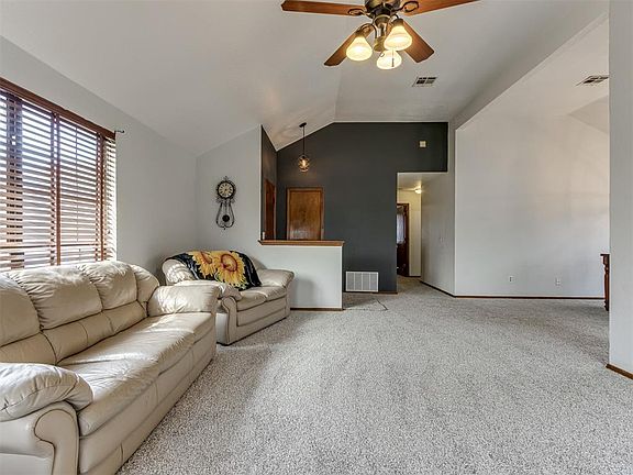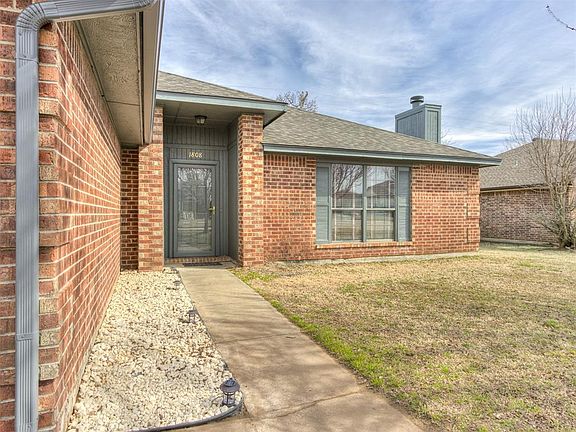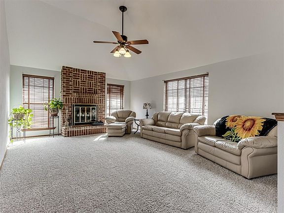 Welcome to your charming Midwest City home! This delightful 3-bed, 2-bath residence boasts a host of wonderful features. As you approach, you'll be greeted by beautiful trees adorning the front yard, creating a serene and inviting atmosphere. Once inside, you’ll discover a home that has been lovingly maintained and updated. A new roof and gutters installed in October 2023 ensure peace of mind for years to come, while the freshly painted exterior and interior offer a bright and welcoming ambiance. The heart of the home lies in the living room, where vaulted ceilings soar overhead and a gorgeous brick fireplace takes center stage, flanked by large windows that flood the space with natural light. The dining area also boasts vaulted ceilings, creating an open and airy feel. The kitchen is spacious, with stainless steel appliances, updated tile floors, a pantry, and a cutout with bar seating that looks onto the dining room. Retreat to the primary bedroom, complete with a vaulted ceiling and ensuite bathroom featuring a double vanity and updated marbled tile in the shower. Outside, the back yard offers a concrete patio area, ideal for relaxing evenings around a fire pit and enjoying the outdoors. Located just a 6-minute drive to I-40 and a 16-minute drive to Tinker AFB, this home offers convenient access to major thoroughfares and amenities. Don't miss out on the opportunity to make this wonderful Midwest City home your own.