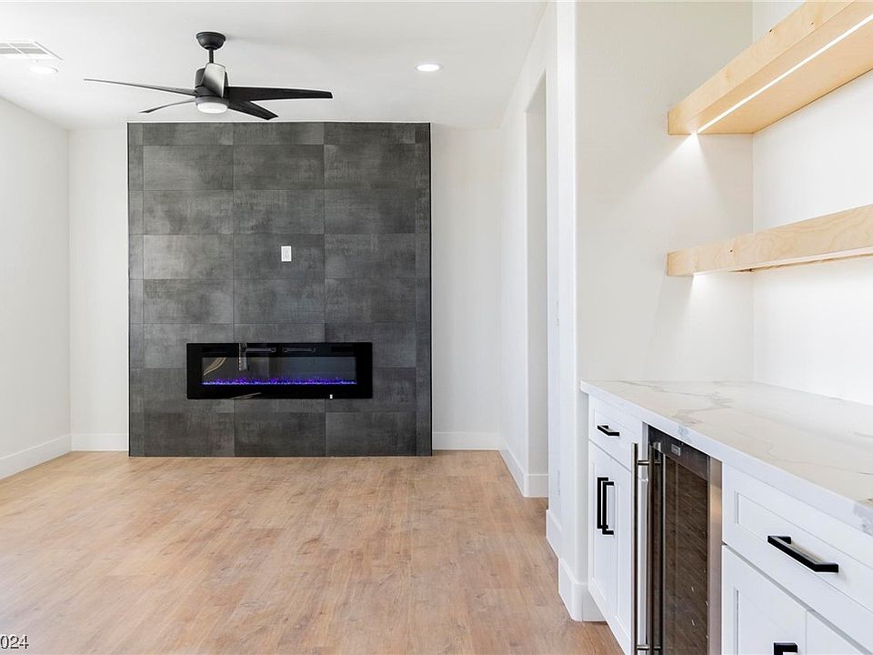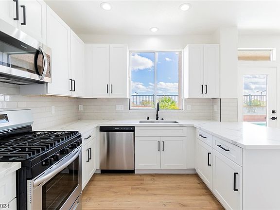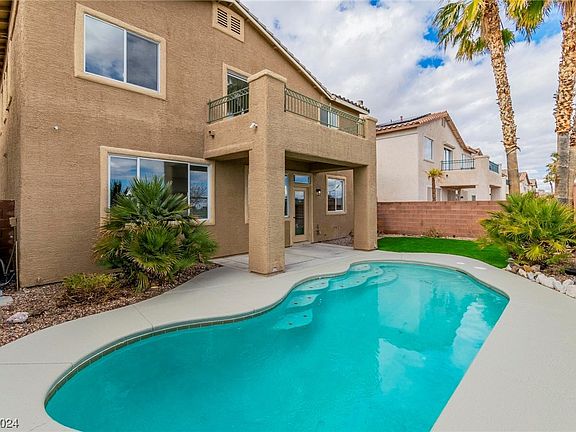 Welcome to this stunning remodeled Summerlin gem! This home has it all from a sparkling pool to a custom bar! Enjoy brand new luxury vinyl plank flooring, carpeting, baseboards, paint throughout, quartz countertops, soft close cabinets, stainless steel appliances, LED fireplaces, bathrooms, fixtures and so much more! Amazing backyard with a sparkling pool, brand new artificial turf and a newly resurfaced pool deck. The seamless floorplan offers elegance and comfort, with the kitchen opening up to the custom bar that can be used for entertainment, a coffee bar, you name it! The primary bedrooms has a spacious patio with a clear view of the Las Vegas Strip! An elegant seating area in the primary bedroom set right in front of the brand new LED fireplace. This home has it all, located in the highly desired Summerlin North community!