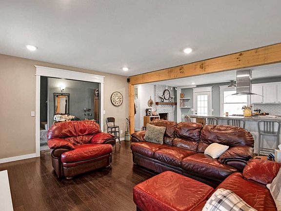 Nestled on 39 acres of mature timber is this beautifully updated 4 bed/2.5 bath home with full unfinished basement. A covered front porch welcomes you inside to a farm house style open concept floor plan. Highlights include hardwood floors, exposed beams, recessed lighting, country style white trim, custom white cabinets with concrete countertops, stainless appliances, & subway tile backsplash. The kitchen dining combo has a white washed wood burning fireplace and access to the back porch. The spacious formal dining room is located just off of the main living area and is the perfect set up for entertaining. The master suite includes a walk in tile shower with rainfall shower head & double vanity. The unfinished basement offers additional storage with potential for additional living space with a grand rock fireplace. Just down the hill you will find a classic red barn that has 4 stalls, hayloft, & approximately 1 acre of fenced area to house your livestock. Enjoy a walk or ride around the property on the existing trail. Spend time relaxing on or around the nearly 1 acre pond that is stocked with both bass & perch. There are wet weather creeks that handle the pond overflow after a long rain.