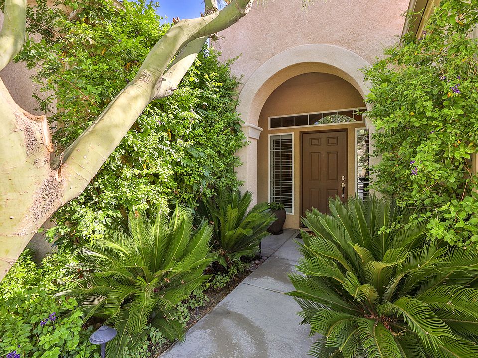 FABULOUS Canyon 2 home with well-appointed color and upgrade schemes: from the coordinated, subtle wall colors, granite countertops and elegant wood throughout. The large kitchen has an eating area, island, walk-in pantry, butler's station, lighted cabinets featuring designated glass doors and pull-out drawers. Walk into the great room with a spectacular entertainment center, fireplace, formal dining room and a wall of floor to ceiling sliding doors, providing a view of the pool, waterfall spa and lush tropical landscaping. Master suite has access to the pool and spa, a grand entrance to the spacious upgraded bathroom and enter the enormous custom closet through the double sided mirrored door. The sizeable guest bedroom accommodates two queen beds and the third bedroom has a majestic view of the mountains. The home boasts an indoor laundry room situated between the kitchen and garage. Enter the garage which has epoxy flooring and creative shelving. The meticulous well-kept landscaping surrounds the home giving green beauty to this desert abode. The clubhouse is nearby and the development offers, pools, spas, BBQ's, tennis, numerous activities, etc. Palm Springs is known for its entertainment, vast restaurants, shopping, hotels, spas, casinos, festivals
