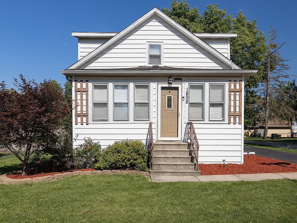Cute 2 bedroom home with wood laminate flooring throughout main floor and upstairs bedrooms. Freshly painted. Updated kitchen with main floor laundry room and 1/2 bathroom. Three seasons room could serve as a mudroom or sunroom. Perfect size yard with one car detached garage. Conveniently located near shopping and highways.