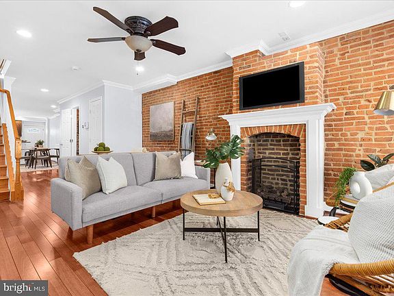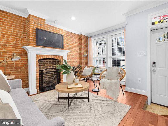 This meticulously crafted two bedroom, two and one half bathroom home in Riverside Park offers urban sophistication, and an unparalleled living experience. As you step through the threshold, you are greeted by the timeless allure of beautiful hardwood floors that flow seamlessly throughout, complemented by intricate crown molding that adds a touch of refinement to every room. The spacious living room beckons you to unwind in front of a cozy gas fireplace, enveloped by the warmth of exposed brick walls that exude classic Baltimore charm. Entertaining guests is a delight in the expansive kitchen, where culinary adventures come to life amidst the backdrop of sleek countertops and stainless steel appliances. The kitchen island with seating invites casual gatherings and lively conversations, while the adjacent dining space sets the scene for memorable meals shared with loved ones. Venture upstairs to discover two spacious primary suites, each offering a tranquil sanctuary to retreat at the end of the day. Conveniently located on the upper level, the laundry ensures that chores are effortlessly managed. The finished basement presents a versatile space that can easily adapt to suit your lifestyle, whether it be a cozy den for movie nights, a productive home office, or a welcoming guest room for overnight visitors. Step outside to your rooftop deck, where panoramic views of the city skyline stretch out before you, providing the perfect backdrop for al fresco gatherings or quiet moments of reflection as the sun sets over the horizon. Parking is a breeze with your own dedicated parking pad, offering the convenience and peace of mind that comes with knowing your vehicle is easily accommodated. Situated just two blocks from the verdant expanse of Riverside Park and quick, easy access to I95 and downtown Baltimore ensures that the vibrant energy of the city is never far away.