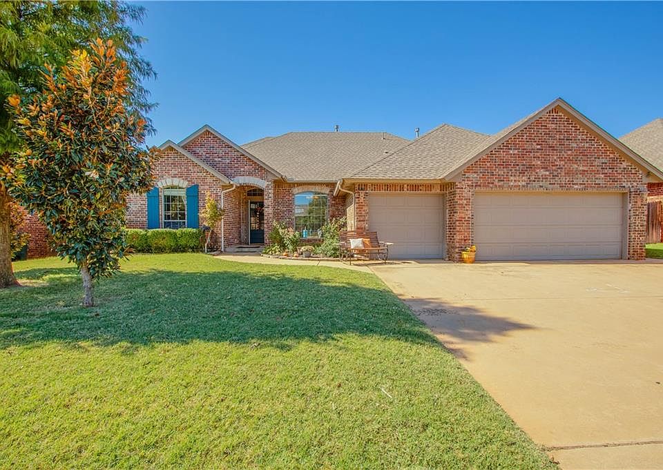 Spacious Edmond home in popular Homestead! This wonderful Edmond schools home features 4 bedrooms, 3 full bathrooms, and a 3 car garage with underground storm shelter. Gorgeous exotic wood flooring in front living room, formal dining and hallways! This house has a spacious updated kitchen with stainless steel appliances, granite counters, and a large center island + storage! Master bedroom is quite large and master bath includes a whirlpool tub, walk-in glass door shower, and walk-in closet! Two living areas, one off the kitchen with fireplace, the other as you enter the home with crown molding. Casual or formal dining area as well, or room for grand piano. The backyard has a wonderful covered patio, an underground sprinkler system. Homestead amenities includes a community pool with active swim team and ponds for fishing for residents, and two playground areas, sidewalks for peaceful neighborhood strolls. New 2019 roof going on in a couple weeks and seller installed solar screens.