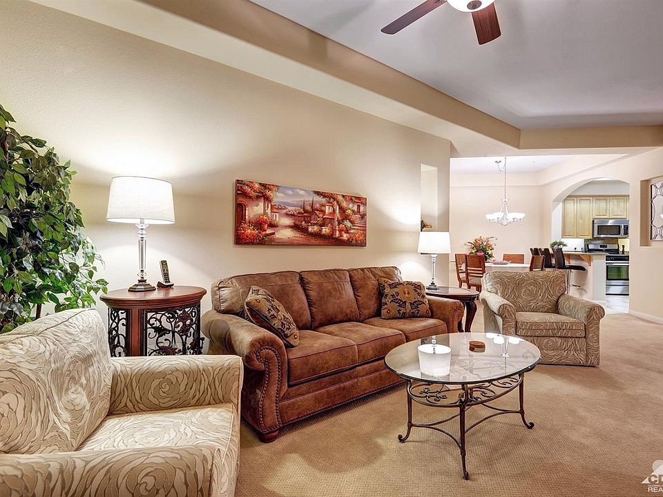 Beautiful Mountain Views from an exquisite, desert condo; this stunning plan defines luxury desert country club living with numerous upgrades throughout. With no detail overlooked, the home has been expertly designed and lovingly maintained. Welcoming and spacious rooms create an open plan perfect for entertaining. The interior wonderfully brings the outside in without taking away from the grand and dramatic architectural details within. Tastefully appointed and highly sophisticated from the pristine tile floors, to clean and intersecting architectural lines. A chef's dream comes true in the gourmet kitchen with spacious surroundings, warm-finished banks of cabinetry, granite countertops, and top-of-the-line appliances. Luxuriate in the master suite with spa-style bath, dual vanities and generously sized walk-in. Guest rooms and private office are also spacious and beautifully appointed. The desert country club lifestyle come alive out on the entertainment balcony.