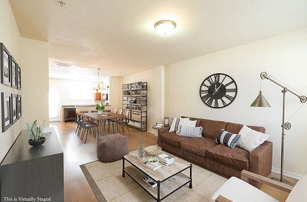 Move in ready! Hardwood floors downstairs. Nice kitchen with island. Combination dining and living room! Great for entertaining! Half bath down. Deck and Parking in the back. 2 Bedrooms upstairs. Master has walk in closet, double vanities and garden tub. Laundry is upstairs in between the bedrooms. Close to everything!
