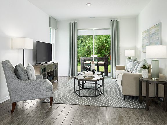 Primary suite is located on the first floor for convenience. White cabinets with Bengal White Granite countertops, Arena Casper Travertine-look tile flooring and warm grey carpet in our Crisp package.