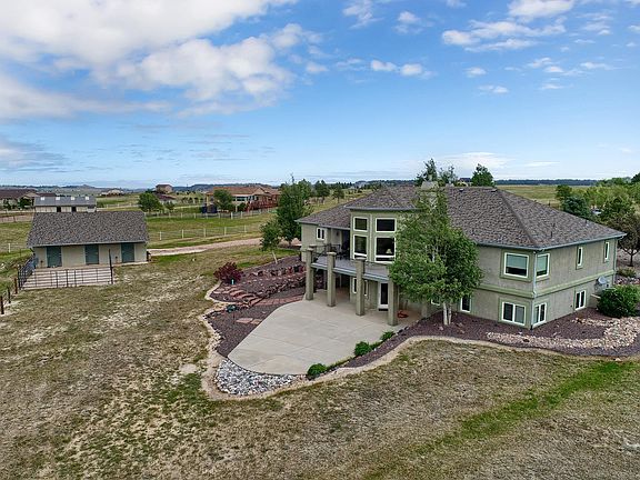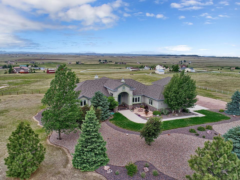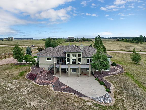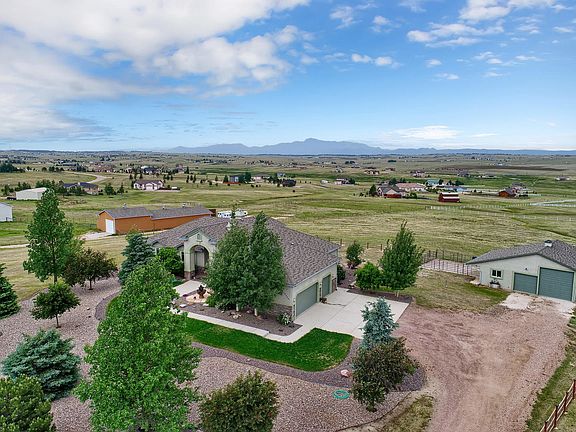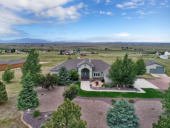 Custom built horse property with amazing views of Pike Peak and the Front Range! Take in the stunning Colorado landscape from the grand entry with lovely oak hardwood. Main level features office with new built in shelving, formal dining room, butler's pantry with wine chiller, breathtaking great room, 2nd dining area and gourmet kitchen. Granite countertops, 42" knotty Alder cabinets, large island with veggie sink, pot filler, and warming drawer. Laundry/mud room has sink, gift wrapping station, and dog wash. You'll also love the central vacuum throughout! Main floor also has 2 bedrooms, including master suite with attached 5 pc bath, amazing shower, and huge walk in closet with 3 way mirror. You'll need to see the basement to believe it! In addition to the large, walk out family room with full wet bar, you'll find a completely custom theater room complete with lobby!