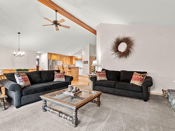 Wood floorsNatural accentsKnotty pine cabinetryWood blindsOpen vaulted great roomRiver rock-accented exterior