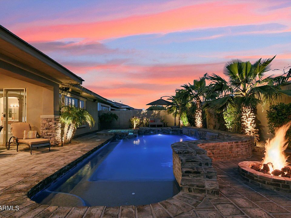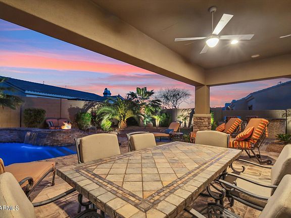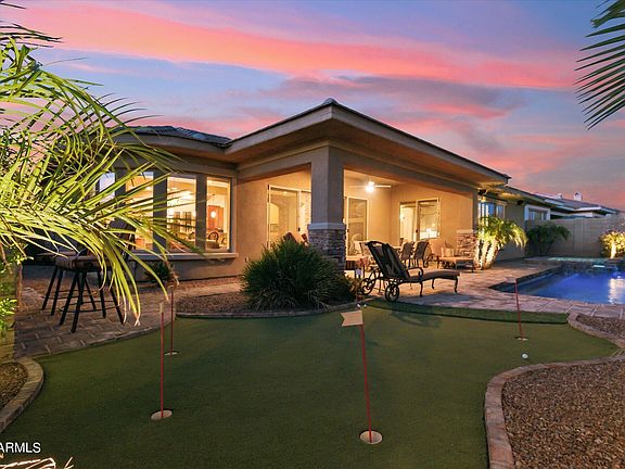 Highly desirable & beautiful, semi-custom T.W. Lewis upscale home featuring 4 large bedrooms, 2.5 baths & office located within the gated golf course community Fairways at Estrella. Private, oversized, tropical resort-style backyard with a sparkling heated pool/spa with 3 waterfalls, gas firepit, built-in BBQ, & 5 hole putting green great for entertaining & enjoyment year-round. All inside & outside furniture, appliances, TVs & kitchen utensils are included at no additional cost making this a truly move-in ready home. 4-ton AC unit & pool pump replaced in 2023. Newer pool/spa gas heater & hot water heater. Open concept with 10-foot ceilings. Spacious open family room w/stone fireplace. Gourmet kitchen features oversized XL prep island, breakfast bar, upgraded granite countertops, walk-in-panty, butler's space, SS appliances, custom backsplashes, & upgraded cabinets w/custom hardware. Soaring rotunda dining nook. Kitchen/family room boasts a sliding wall of glass overlooking the pool & resort-style backyard. Primary bedroom has sliding glass doors leading out to the relaxing backyard & features double sinks & two large walk-in closets, tile walk-in shower & jetted bathtub. Travertine flooring with beautiful medallions in main areas w/Bamboo flooring in primary bedroom & office. Surround sound in family room, backyard & primary bedroom. Plantation shutters & coffered ceilings. Inside stone accent walls, archway & outside stone pillars add elegance to the home. LED lighting inside & outside. 3rd car garage converted into 4th bedroom. Great schools are located less than 1 mile from home. Enjoy resort-style living in Estrella Mountain Ranch. A Troon managed; Nicolas designed Golf Course is a highlight! Canoes & kayaks are available for residents use at the Yacht Club on the North Lake. Starpointe Clubhouse is also located on the North Lake & boasts a waterpark, heated lap pool, fitness center, restaurant & meeting rooms. The South Lake features BBQ cabanas, beach volleyball, a large playground, pickle ball, tennis & basketball courts. The Presidio Clubhouse has a heated play pool, splash pad, demonstration kitchen as well as a fitness center & restaurant. Children's playgrounds, tennis, pickleball & basketball courts & numerous hiking & biking trails are located throughout the area.